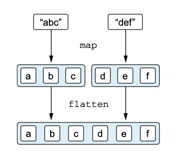 flatMap: 주어진 람다를 컬렉션의 모든 객체에 적용(map)하고, 적용한 결과 얻어지는 여러 리스트를 한 리스트에 모은다(flatten).