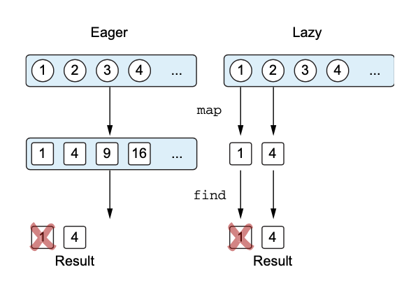 원소에 연산을 차례대로 적용하다가 결과가 얻어지면 그 이후의 원소에 대해서는 변환이 이뤄지지 않을 수도 있다.